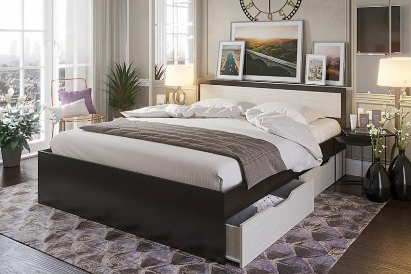 Особенности кровати: Удобная двухспальная кровать c изголовьем. Стильный современный дизайн. Оснащена бельевыми ящиками. Основание не подъемное - планки шириной 140 мм и ДВП. Роликовые направляющие. Максимальная нагрузка на спальное место 100 кг. Рекомендуемая высота матраса 150 мм. Матрас в стоимость не входит и приобретается отдельно. Цвет (дуб белфорт, дуб млечный или дуб анкор) может быть определён фабрикой по умолчанию.